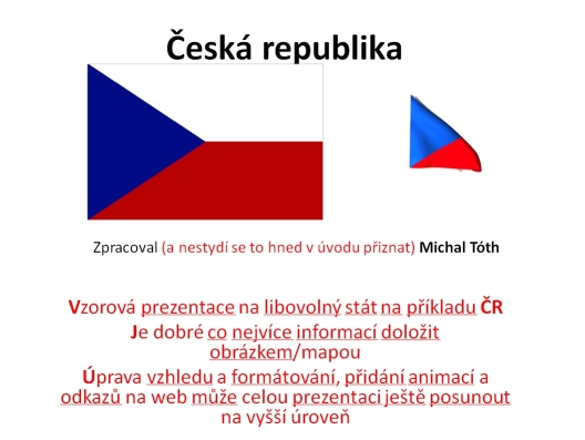 Vzorová prezentace s osnovou (na příkladu ČR), která je vodítkem pro prezentace žáků na libovolný stát. Splnění nebo nesplnění jednotlivých bodů podle vzorové prezentace, mi pak pomáhá při hodnocení.