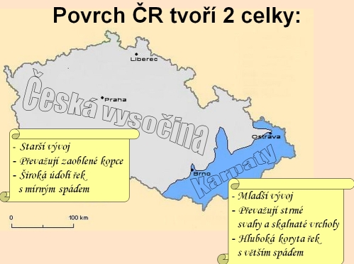 Povrch České republiky - obrazový přehled v úvodu (srovnání se světem) i v závěru (příklady přírodních unikátů, mezitím schémata, rozdělení podle vzniku a seznam nejznámějších geomorfologických celků