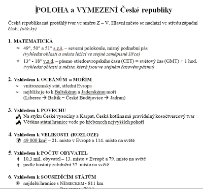 Poloha a vymezení území České republiky - přehled pouze v textovém formátů i s úkoly a mapami národnostních oblastí a výběžků