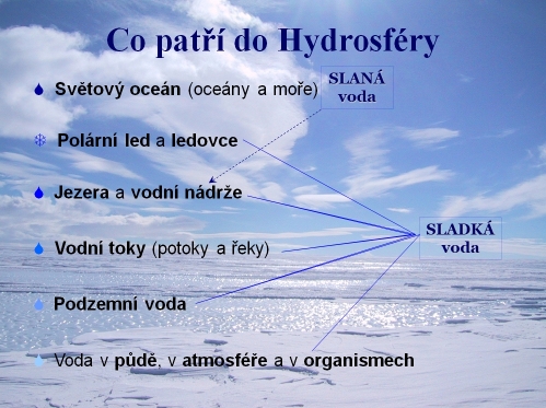 Hydrosféra - Světový oceán - rozdělení vody na Zemi, Oběh vody, vertikální a horizontální členění, dmutí, proudy, environmentální problémy
